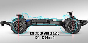 Wydłużone podwozie modelu Raptor R Ultimate charakteryzuje się większym rozstawem osi, opracowanym specjalnie dla tego zastosowania. Oprócz zapewnienia odpowiednich proporcji, większa powierzchnia styku z podłożem poprawia stabilność przy dużych prędkościach i udoskonala prowadzenie. Dodatkowe wzmocnienia podwozia poprawiają sztywność konstrukcji, umożliwiając dynamiczne manewry i wykonywanie akrobacji w powietrzu.