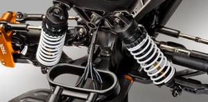 Amortyzatory GTR stanowią szczytowe osiągnięcie w dziedzinie technologii zawieszenia. Obudowy amortyzatorów wykonane z aluminium pokrytego PTFE mieszczą o ponad 70% więcej oleju niż standardowe amortyzatory Ultra Shocks™, a ich gładkie wały pokryte azotkiem tytanu są odporne na zarysowania, zwiększają trwałość i eliminują „tarcie statyczne”. Uszczelki typu X-ring zatrzymują olej wewnątrz i zapobiegają przedostawaniu się zanieczyszczeń, zapewniając płynne, stałe tłumienie i miękkie działanie zawieszenia. Regulacja napięcia wstępnego sprężyny i wysokości zawieszenia jest tak prosta, jak obrócenie kołnierzy gwintowanych — nie są potrzebne żadne podkładki dystansowe.