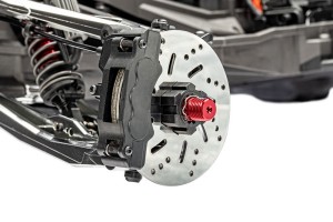 Potężne przednie hamulce tarczowe współpracują z tylnymi hamulcami silnikowymi, zapewniając potężną i kontrolowaną siłę hamowania na 4 koła. Osłonięte kable zaciskają zaciski na nawierconych tarczach ze stali nierdzewnej, zapewniając autentyczność w skali. Cyfrowe serwo 2075 uruchamia hamulce za pomocą regulowanego łącznika, zapewniając większą precyzję i kontrolę hamowania