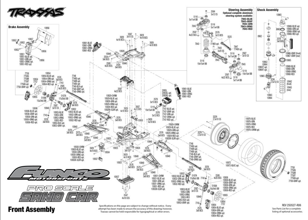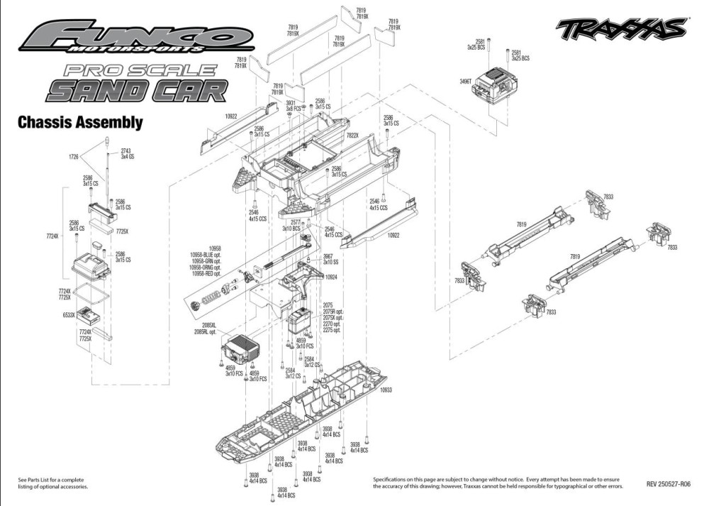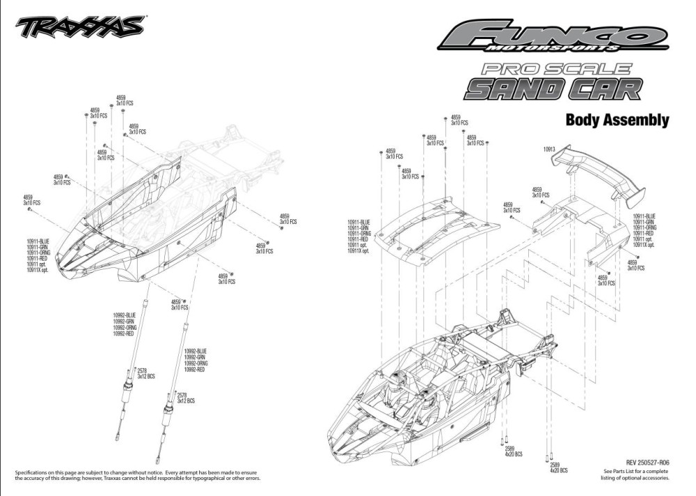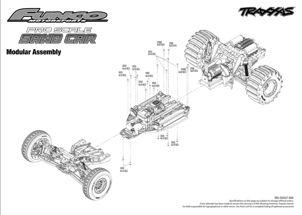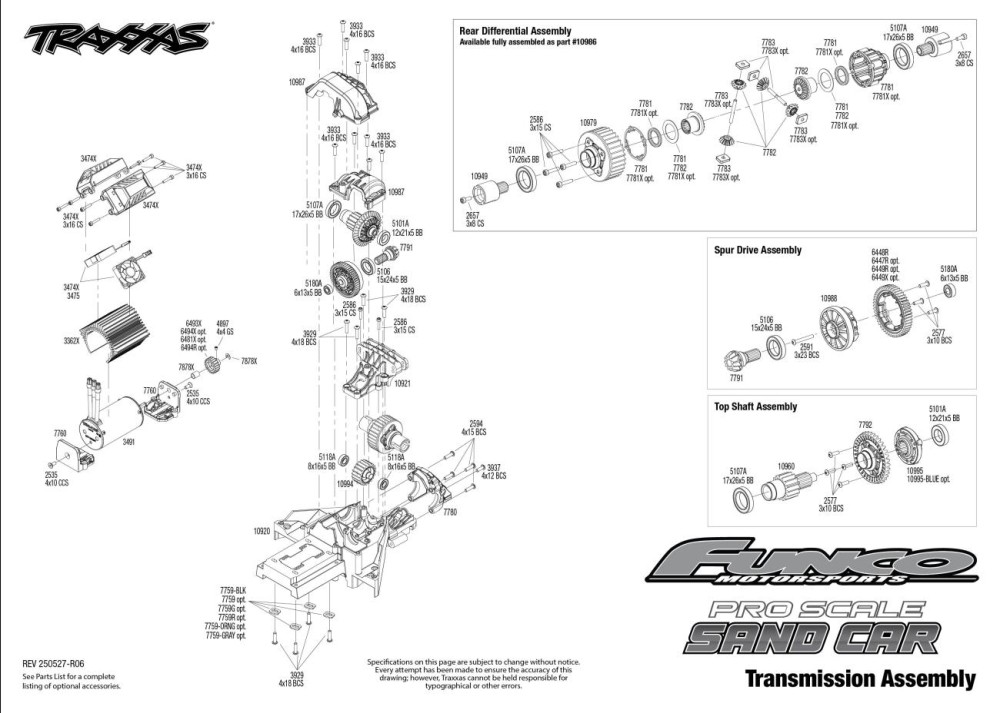 Traxxas dołożył wszelkich starań, aby dokładnie odwzorować pełnowymiarowy model Funco GTU Sand Car. Pro Scale Sand Car posiada pełne wnętrze z deską rozdzielczą i figurkami kierowców oraz replikami zdalnie sterowanych amortyzatorów 3,5″. Silnik to dzieło sztuki, składające się z 9 różnych części, w tym licencjonowanych filtrów powietrza R2C i doładowania Whipple.