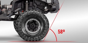 Dzięki kątowi natarcia wynoszącemu 57,93° z przodu, TRX-4 jest gotowy do pokonywania ścian. Równie imponujący kąt zejścia wynoszący 46,50° zapewnia ekstremalne możliwości, nawet w najgłębszych koleinach.