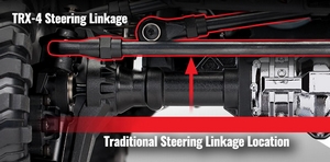 Drążek kierowniczy i poprzeczny są zamocowane wysoko na osiach portalowych, co chroni je przed ewentualnym uszkodzeniem. Dzięki temu TRX-4 może pokonywać przeszkody, zmniejszając ryzyko uderzenia drążków kierowniczych o skały.