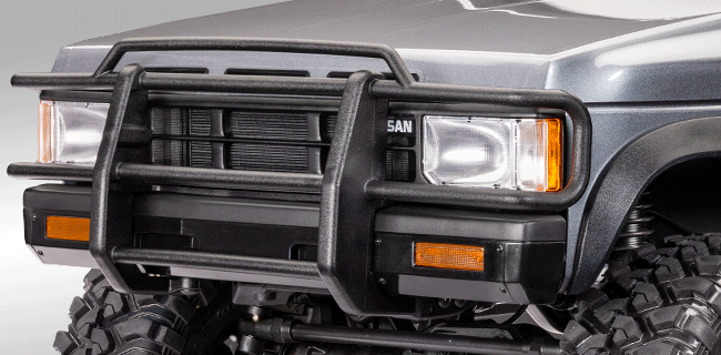 TRX-4 Pathfinder ma replikę czarnej przedniej kratki ze zintegrowanymi soczewkami i zderzakiem, które nadają mu solidny wygląd. Szczegółowe reflektory i tylne światła są kompatybilne z opcjonalnym zestawem świateł Pro Scale Light Kit 1(sprzedawanym oddzielnie), który zapewnia jeszcze większy realizm.