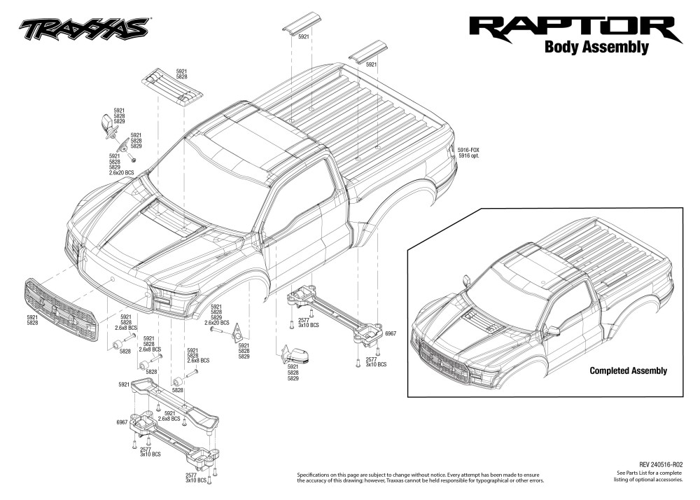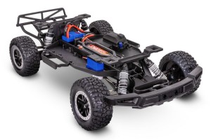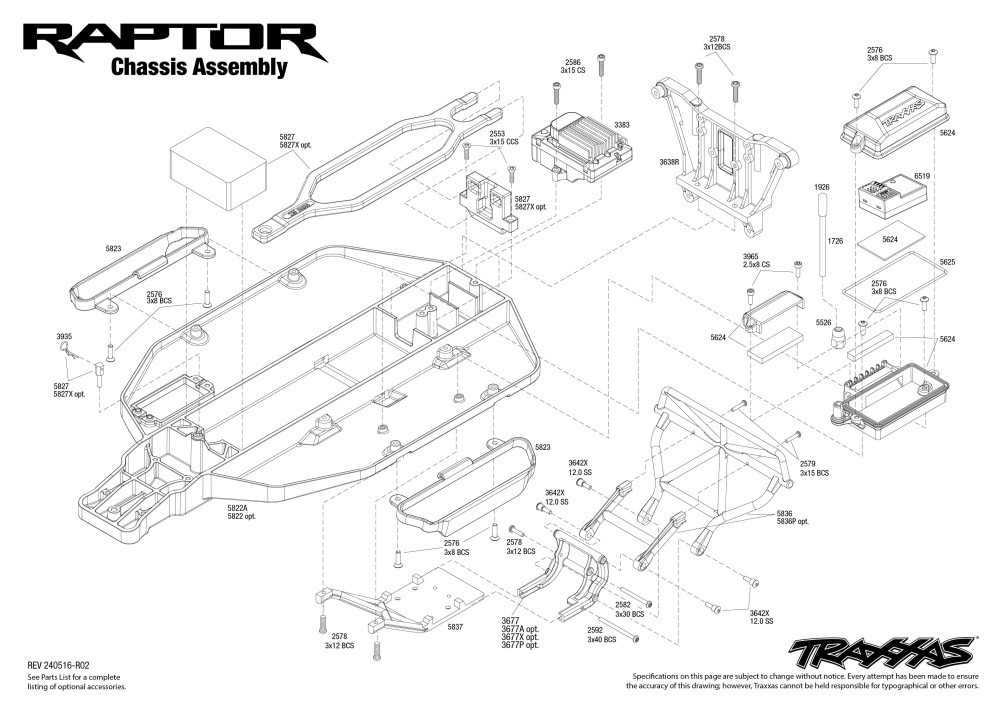 Podwozie Raptora jest współdzielone z wielokrotnie nagradzanym modelem Slash i ma rozstaw osi 13,2″ oraz prześwit ponad 3,5 cala. Podwozie zawiera otwory spustowe i kanał tacy akumulatora do prowadzenia przewodów serwa do odbiornika. Opcjonalne piasty montażowe elektronicznej kontroli prędkości są wbudowane w podwozie, co ułatwia modernizację do ekstremalnej mocy bezszczotkowego systemu zasilania BL-2s. Z myślą o zawodach na torze wyścigowym, mocowanie transpondera znajduje się pod przednią wieżą amortyzatorów.