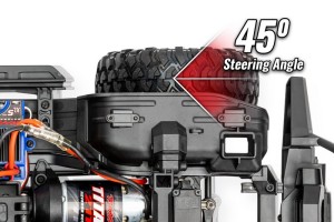 TRX-4 posiada układ kierownichy pozwalający na obrót kół w zakresie 2 x 45st. To pozwala na wykonywanie ciasnych zakrętów w trudnym - kamienistym terenie.