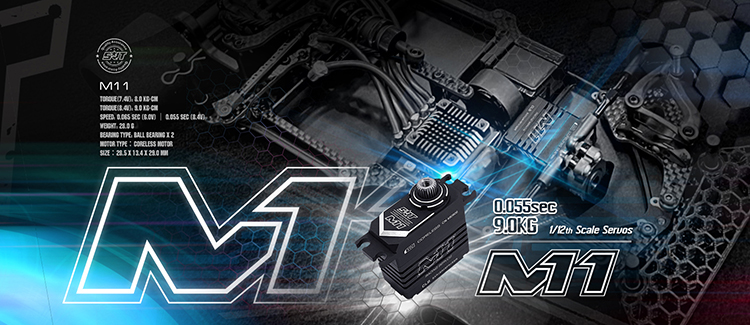 SRT przedstawia M11 - specjalny serwomechanizm do samochodów elektrycznych w skali 1/12 z całkowicie metalową obudową wykonaną w technologii CNC i niewielką masą wynoszącą zaledwie 28 gramów. Przekładnia ze stali nierdzewnej 25T + aluminium 7075 stanowi serwomechanizm o wysokiej wytrzymałości przeznaczony do wyścigów, z precyzyjnie dopasowanymi zębatkami, wyposażony w najnowszy układ PCBA, obsługujący wiele trybów ultra wysokiej prędkości SXR, SFR, SR, SSR.