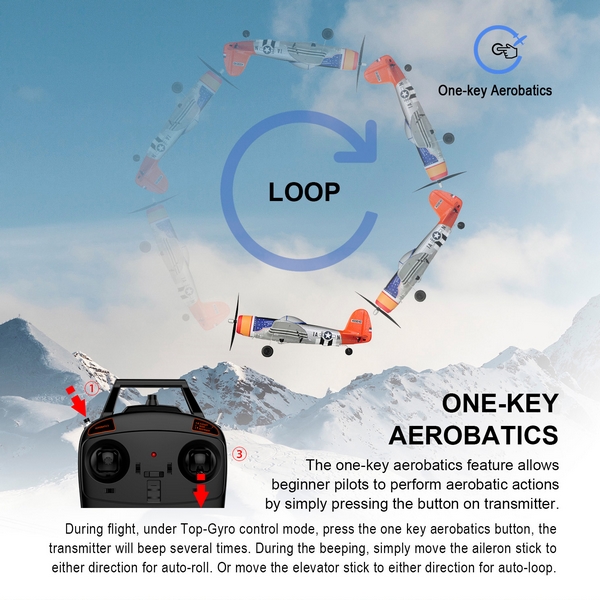 System żyroskopowy pozwala na automatyczne wykonanie beczki - jak pokazano na rysunku powyżej oraz pętli. Podczas lotu w trybie 2 przełącznika trybu żyroskopu, po jednorazowym naciśnięciu przycisku "Aerobatics", pojawi się kilkukrotny sygnał dźwiękowy. Oznacza on aktywację funkcji. Wykonanie beczki następuje po wychyleniu drążka lotek w wybraną stronę. Wykonanie pętli następuje analogicznie jak wyżej - po wychyleniu drążka steru wysokości w wybraną stronę.