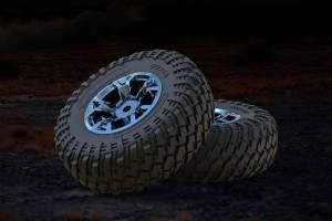 Gumowe opony terenowe SALVATOR'a mają dużą przyczepność. Powierzchnie obręczy są w kolorze chromu.
