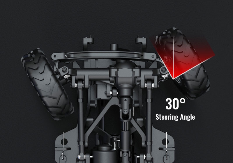Kąt skrętu kół wielkości 30°, zapewnia wyjątkowo ciasny promień skrętu i ekstremalną zwrotność na małych przestrzeniach, gdzie liczy się każdy centymetr. Serwomechanizm o sile 0,5kg, zapewnia dużą siłę skrętu, nawet na grubym dywanie.