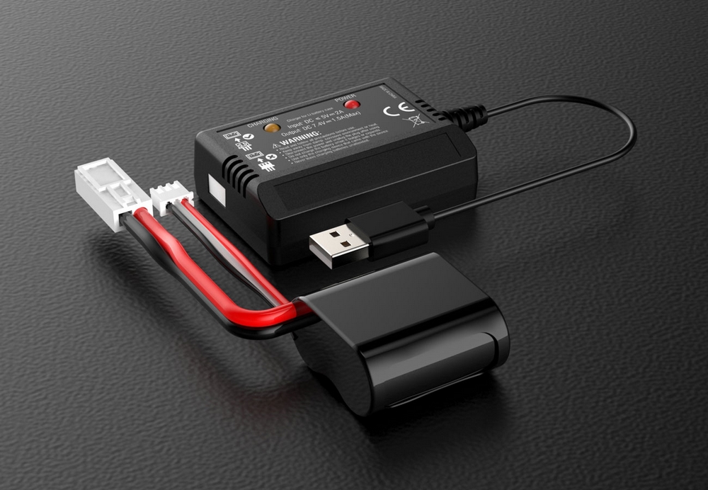 Zestaw zawiera ładowarkę USB i akumulator Li-Ion 7.4V/1500mAh. To wszystko wystarczy do obsługi bez konieczności zakupu dodatkowego osprzętu.