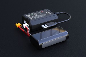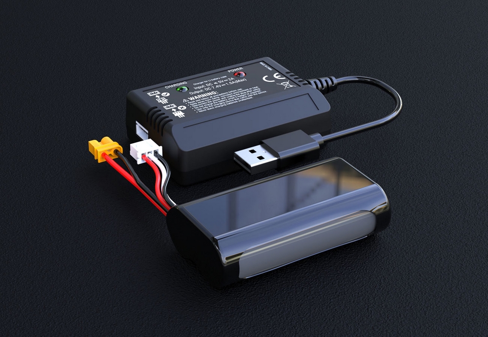 Akumulator Li-Ion o napięciu 7.4V ma pojemność 2000mAh, co przy pełnym naładowaniu, pazwala na zabawę przez 8-10 minut. Ładowarka USB z balanserem ładuje prądem 1500mA.